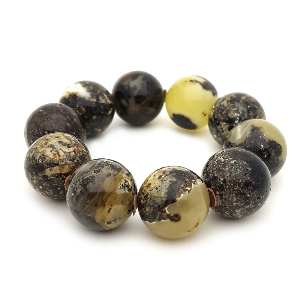 Браслет "Шар" из полированного янтаря перепелиного цвета, собранный через кожаные проставки.